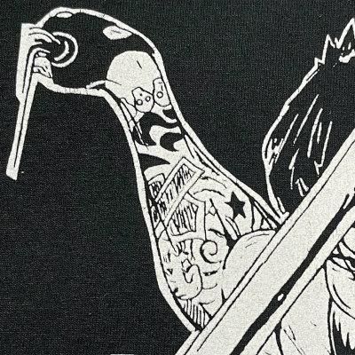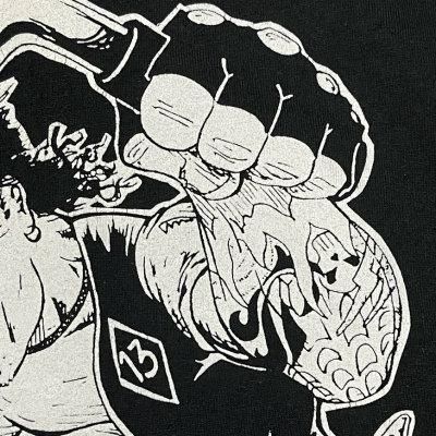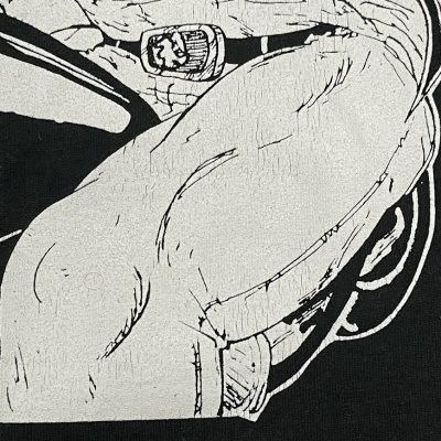 グラフィックは素肌にベストを羽織りタトゥーまみれの筋肉隆々バイカーが、